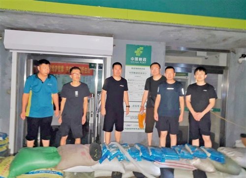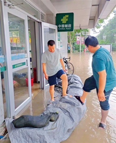 河北省涿州市邮政分公司抢险小分队用沙袋、防水塑料布在营业厅、邮件处理中心门口围挡防洪,开展抢险救援。□张宇梅 摄影报道