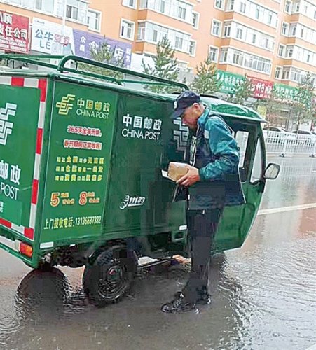 连日暴雨,路段积水,黑龙江省克东县邮政分公司投递员冒雨蹚水投递。□许文佳 摄影报道