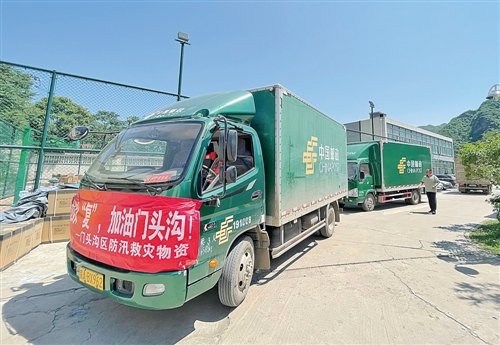 8月8日,北京市邮政分公司成立应急运输团队,为门头沟区清水镇政府运送防汛救灾物资。□王宇萱 摄影报道