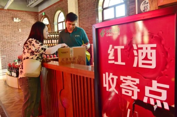 在昊苑村格莉琪酒庄的红酒收寄点,西夏区邮政分公司火车站揽投部的叶万文驻点为参观酒庄的游客提供红酒打包寄递服务。