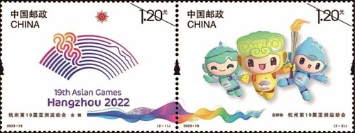 发行体育赛事主题邮票,是历届国际大型综合性赛事的惯例,也是进行赛事宣传、普惠大众的重要途径。根据2023年纪特邮票发行计划,中国邮政将于9月23日杭州亚运会开幕当天正式发行《杭州第19届亚洲运动会》纪念邮票。杭州亚运会纪念邮票一套两枚,两枚邮票主体分别表现杭州亚运会会徽和吉祥物,衬以核心图形“润泽”,充分直观地反映出杭州亚运会主题。邮票采用高网线凹印制版,多专色叠印,可提升色彩饱和度;异型齿孔表现西湖“三潭映月”形状,这是属于杭州独一无二的印记;邮票采用荧光油墨防伪技术,紫外线灯下可观察到数个橘色杭州地标,地域特色跃然纸上。此外,杭州亚运会纪念邮票首日封、版式一、版式二和特殊版式个性化邮票图稿同步发布。其中,《四时江南看亚运》《梦圆》以及《金秋江南精彩亚运》开闭幕主题个性化邮票巧妙融合中华文化和亚运美学,创新版式设计和工艺应用,呈现浓浓的杭城风韵和满满的亚运情谊。