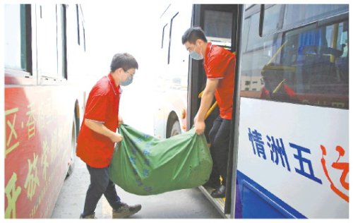 工作人员将分拣完的快递包裹搬上公交车,送往镇级快递网点。(□资料图)