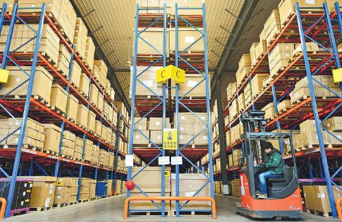 在马瑞利近6000平方米的仓库内,采用约800个立体货架,邮政人员运用仓储信息系统进行货物管理,可实现自动化的先进先出管控。 □孙康 摄