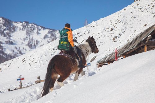 暴雪后的禾木乡行路艰难。为将邮件及时送到半山腰处的养蜂户家中,乡邮员在进入山区后骑马投送邮件。□安昆 摄