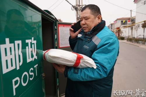 全国人大代表、中国邮政集团有限公司邢台市分公司基层投递员郭红岗电话通知村民取快递。长城网·冀云客户端记者 刘俐验 摄