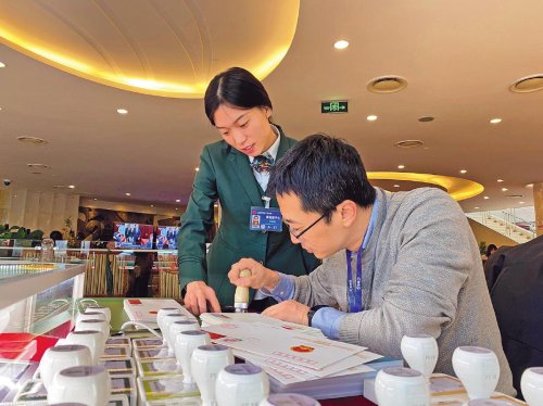 李晓爽是梅地亚中心临时邮局的营业员。今年,梅地亚中心临时邮局为两会驻地新闻记者提供了种类丰富的邮品。李晓爽提前准备,认真了解各类邮品的特点,力求在服务上精益求精。她说:“两会服务让我在政治意识、服务意识和营销能力等方面得到了明显提升。” □中国邮政报记者 吕磊 马佳玉 摄