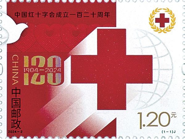 《中国红十字会成立一百二十周年》纪念邮票图案以红十字为主体元素,结合环环相连的心形图案与和平鸽等元素,阳光照射下的红十字象征着“人道、博爱、奉献”的红十字精神熠熠生辉,体现了中国红十字事业120年的辉煌发展历程。
