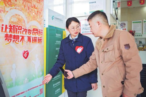 “先生,感谢您为困难高中生捐赠了一份邮爱基金!”3月20日,邮储银行安徽省六安市分行组织“邮爱3·20”活动,广大员工积极捐赠爱心基金。同时,立足营业网点阵地进行公益宣传,凝聚社会力量,让点滴爱心汇成“大海”。图为该分行营业网点大堂经理引导客户参与“邮爱公益”活动。