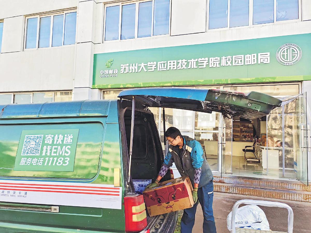 邮政工作人员将苏州大学应用技术学院校园邮局的出口邮件搬运装车。