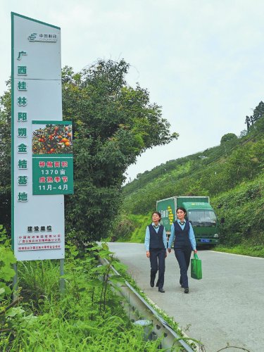 阳朔县邮政分公司员工来到白沙镇古板水果专业合作社,上门了解金桔生长情况。 □中国邮政报记者 吕文礼 摄