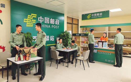 崇左市邮政分公司员工在凭祥军邮驿站服务部队官兵。□唐波 摄