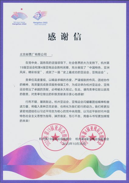 我公司一直致力于为客户提供高品质、高技术、高等级的防伪印制服务,使客户获得更完善、更贴心、更满意的体验。自业务开展以来,在项目组的不断努力下,对内联系公司生产,对外沟通客户进行协调。在亚运期间、“中国国家队”项目运营期间,市场部顶住压力,按时按量将防伪标签顺利发运,协助赛事产品正常发售,获得客户的一致好评,分别收到来自亚组委和国家体育总局的感谢信。