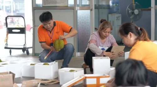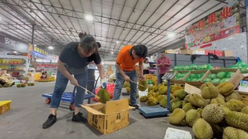 采访完徐钰锋,记者跟随潘新杰来到离邮政仓不远的水果市场,为当日线上订单客户挑选榴莲。“榴莲要通过敲打来分辨生熟程度。偏生,就适合发较远的地区;偏熟,则适合发往近的地方,这样可以保证客户收到水果时生熟正好。如果天气热,还要加冰来保证果肉新鲜。芒果如果是发到东北,我们会加装保温袋来避免水果冻伤。”说起不同水果的“发运经”,潘新杰滔滔不绝。
