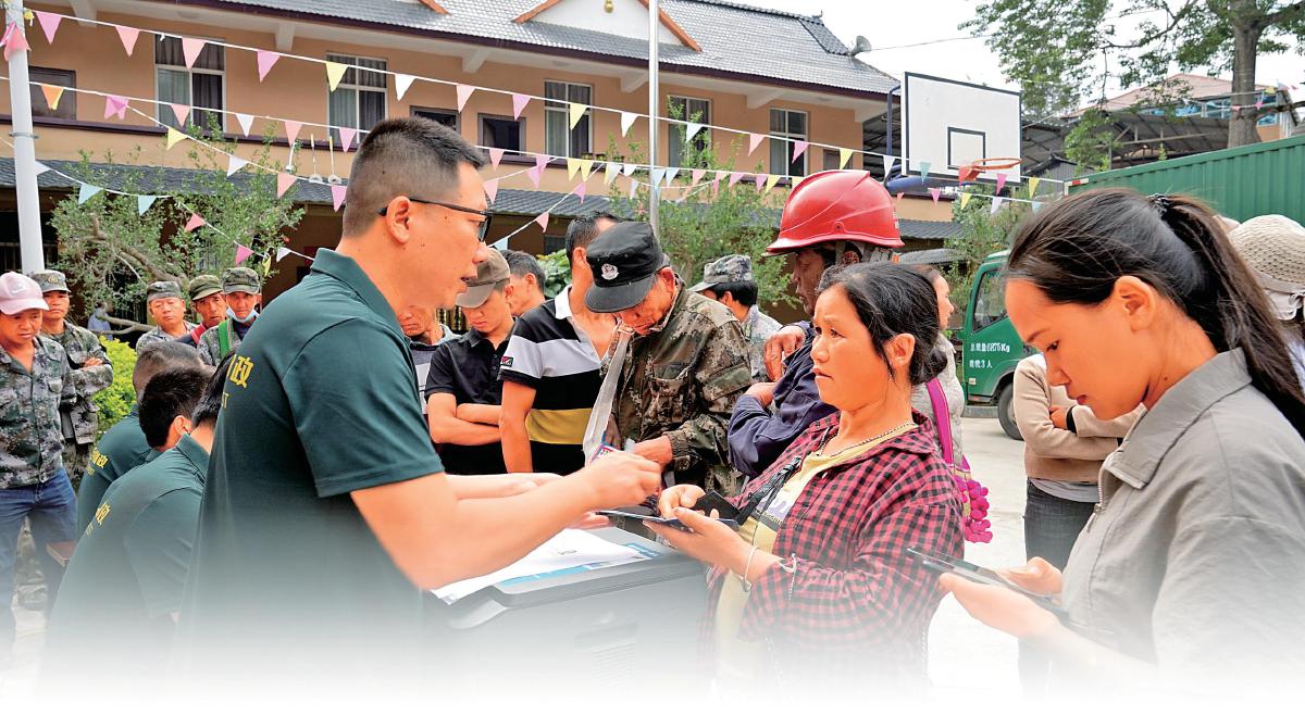 5月16日,在云南省普洱市澜沧县阿里村邮政临时服务点,邮政员工为村民现场办理摩托车灭失注销登记、保险缴纳等业务,受到群众的热烈欢迎。□中国邮政报记者 张晋通 摄