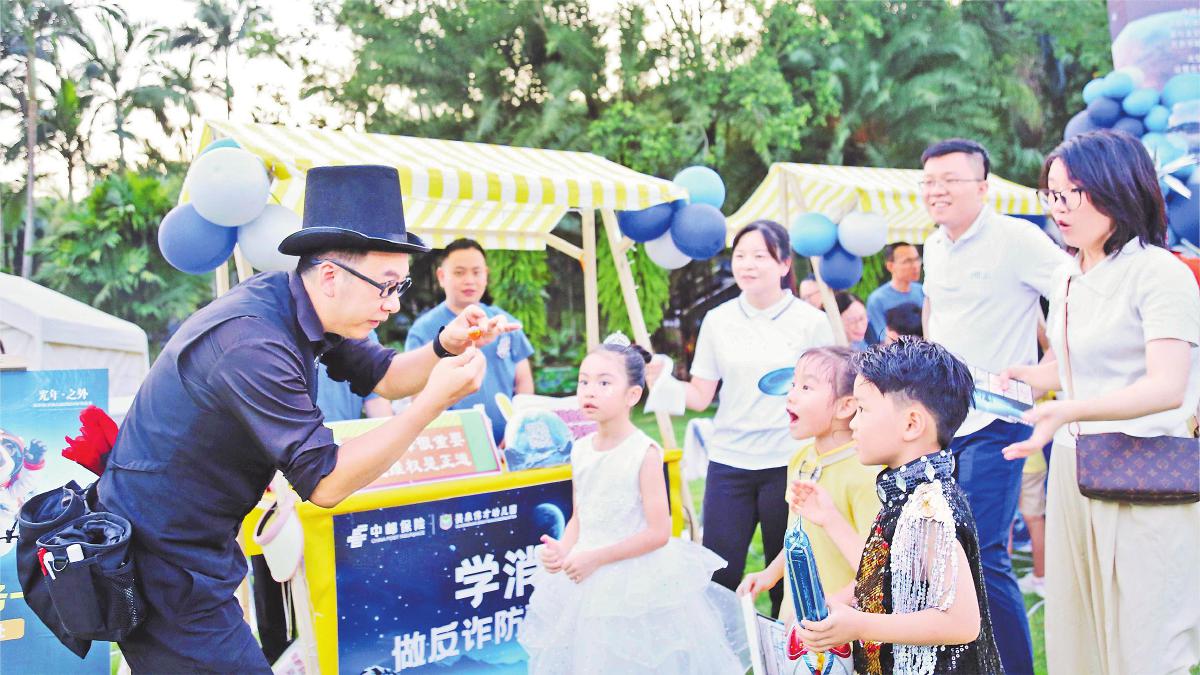 近期,随着“7·8全国保险公众宣传日”活动的开展,中邮保险广西壮族自治区分公司携手南宁市邮政分公司举办了一场别开生面的亲子航天主题消保宣教活动。活动现场,不仅有航天知识讲座和星空观测体验,还设置了保险知识竞答、魔术表演和时光慢递明信片等环节,激发了孩子们的学习兴趣。图为家长和孩子们认真观看魔术表演,积极参与消保知识问答。