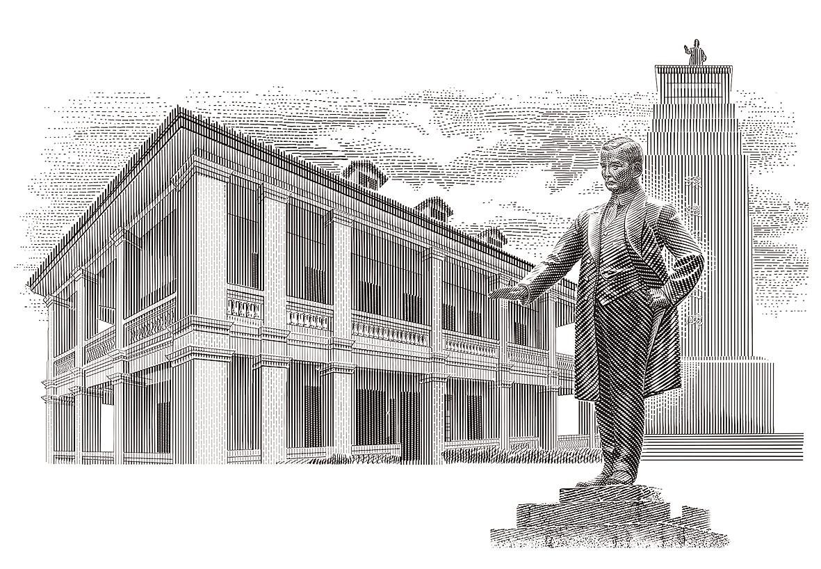 由于没有其他颜色的辅助,单色雕刻对于创作的要求更加严苛,但这也激发了雕刻师创作的欲望与激情。邮票一图的雕刻者徐喆,也是《纪念黄埔军校建校九十周年》纪念邮票的雕刻者,能再次参与纪念黄埔军校题材的邮票创作,成为他对自己十年职业生涯的审视和挑战。邮票一图“黄埔军校校本部”,构图与1994年发行的《纪念黄埔军校建校七十周年》相似,都以黄埔军校校门的正面影像为创作主体,但采用了不同的设计和雕刻手法,呈现出截然不同的视觉风格。在雕刻线条的加持下,画面饱满浑厚,带给观者以典雅大方的感官体验。选用深蓝色雕刻油墨,象征深厚的文化底蕴和历史积淀,紫光灯照射下,绿色荧光衬托出古树的生机勃勃。