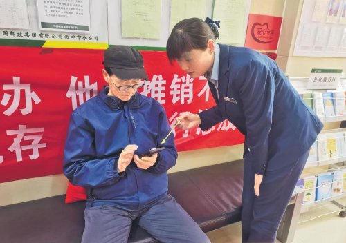 李倩教客户使用手机办理业务。