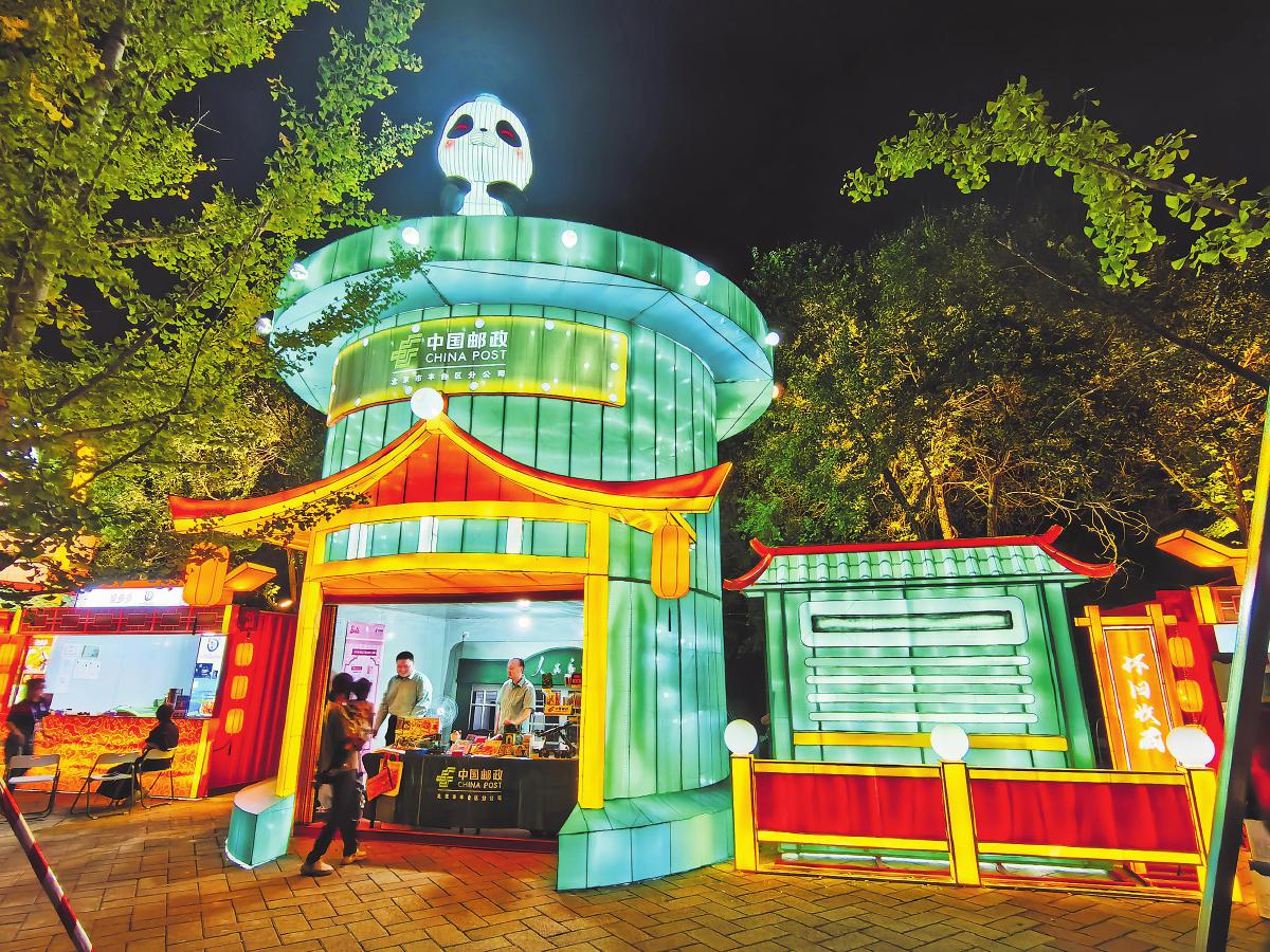 9月14日,北京首届“京彩灯会”——园博园中秋国庆彩灯游园会盛大开幕。此次灯会规模宏大,是四川自贡灯会在北京的再度精彩呈现,为广大游客带来了一场融合传统文化与现代创意的视觉盛宴。灯会上,一组蓝绿色调的邮筒花灯格外引人注目。这组花灯具有浓厚的中式建筑风格,展现了邮筒的传统形象,特别是上方的熊猫设计,憨态可掬。为更好地服务“京彩灯会”,北京市丰台区邮政分公司专门设计了园博园灯会纪念章,还推出了一系列融合邮政传统文化与现代元素的文创产品,深受游客的青睐。