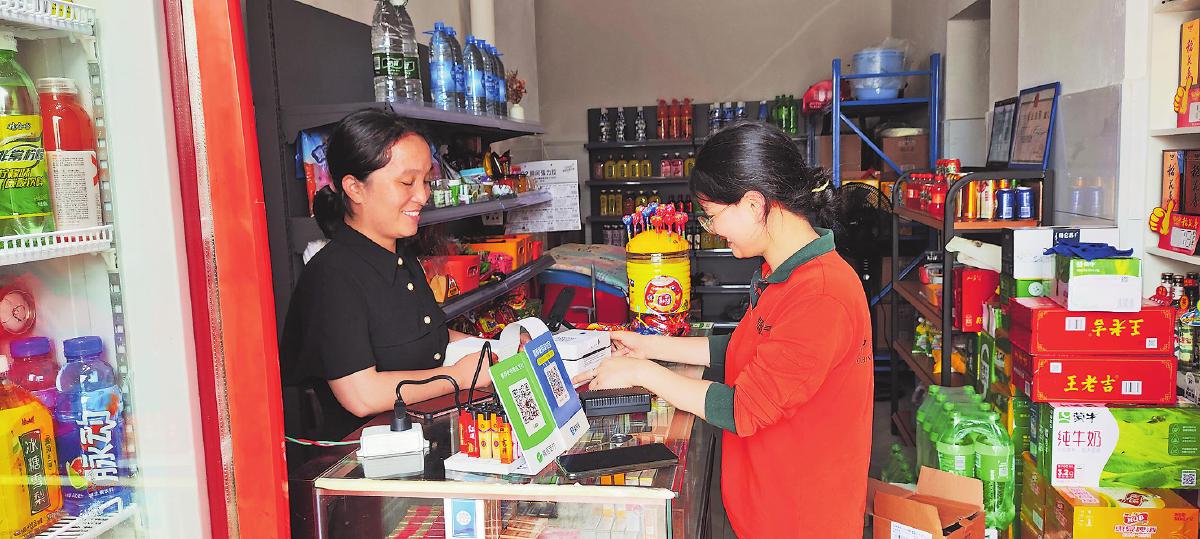 揽投员在居民小区便利店宣贯“寄件宝”扫码操作流程。  □黄舒颖 摄