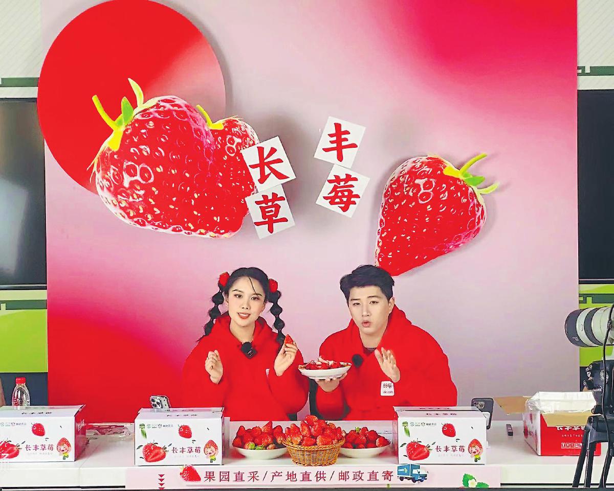 合肥邮政直播团队开展溯源直播,为长丰草莓带货。□陈晶 摄