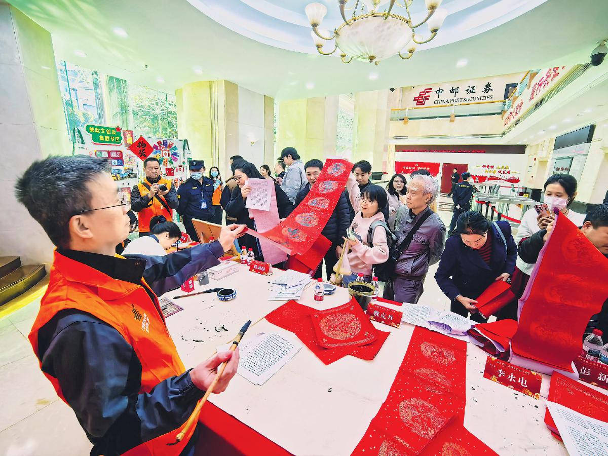祥龙摆尾送旧岁,灵蛇献瑞启新春。临近春节,广东省深圳市邮政分公司工会牵头开展了“蛇来运转 邮行千里 福送万家”义写春联活动。在宝通大厦、福田滨海营业所、邮政大厦“职工之家”,特邀的书法家们在一张张喜庆的红纸上挥毫泼墨,一副副春联、一个个“福”字跃然纸上,将饱含着的浓浓喜气和美好的祝福传递给了基层员工和附近的社区居民。