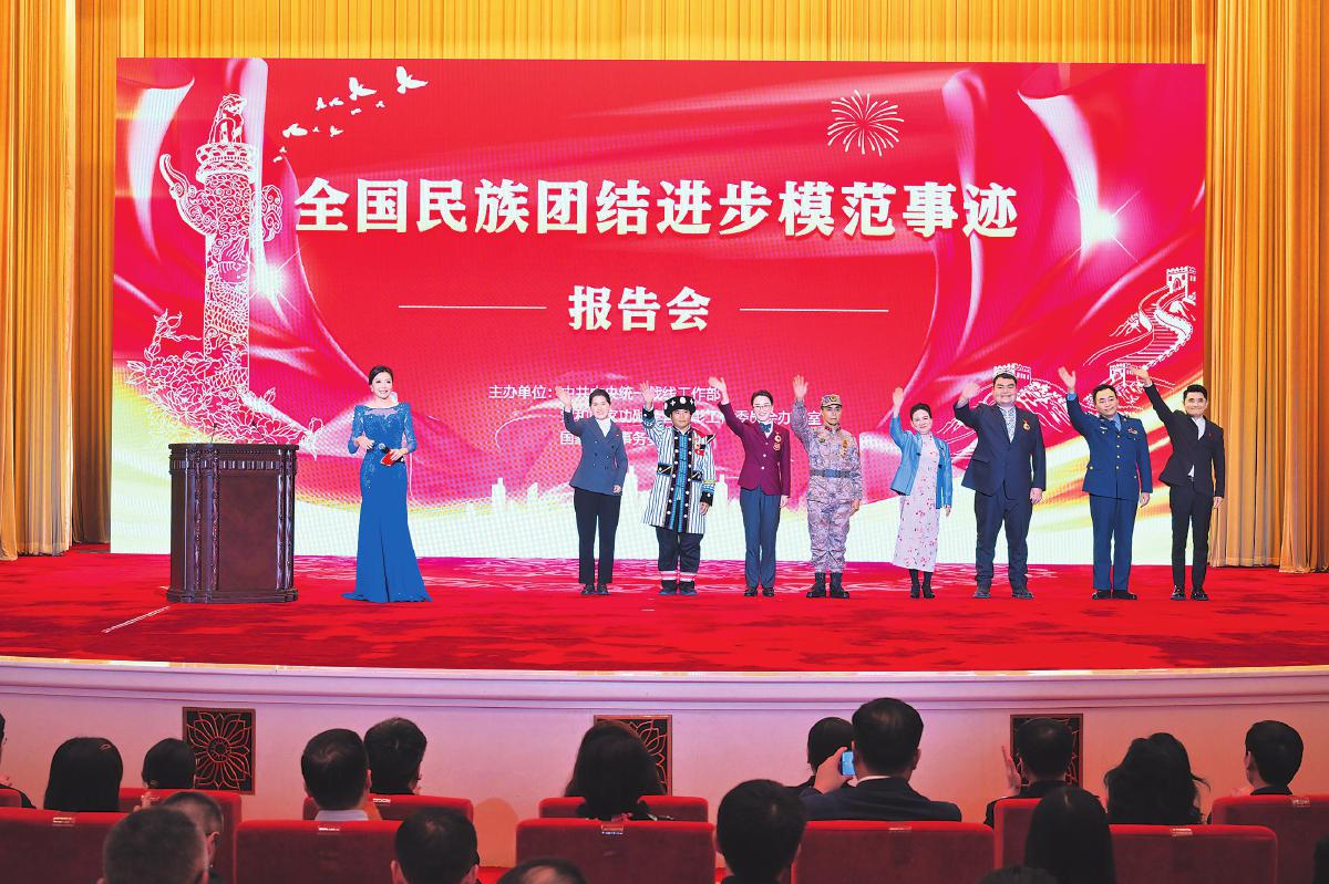 12月27日下午,由中央统战部、党和国家功勋荣誉表彰工作委员会办公室、国家民委联合举办的全国民族团结进步模范事迹报告会在北京人民大会堂举行。包括桑南才在内的8名全国民族团结进步模范集体和模范个人代表聚焦学习贯彻全国民族团结进步表彰大会精神,生动讲述围绕铸牢中华民族共同体意识主线团结奋进的感人故事。身着傈僳族盛装的桑南才作为模范个人代表第一个登台。