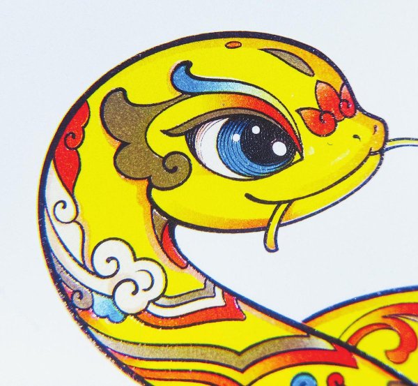 此次使用的特种黄墨具有强烈光泽感,使得邮票在光线下呈现出独特的金属光泽和纹理效果,整体颜色更加干净。在第一枚“蛇呈丰稔”中,金色的蛇身与璀璨的麦穗交相辉映。在第二枚“福纳百祥”中,蛇身主体和背景搭配使用高光泽特种黄墨和特种红墨表现,契合乙巳年吉祥的主题,体现了对生肖文化和邮票艺术的尊重和推崇。在紫外灯下,荧光红色彩鲜艳、显色明亮,敦煌壁画元素映入眼帘,呈现出独特的视觉效果,增加了邮票的辨识度和安全性,同时赋予邮票更加生动、亮丽的色彩效果。