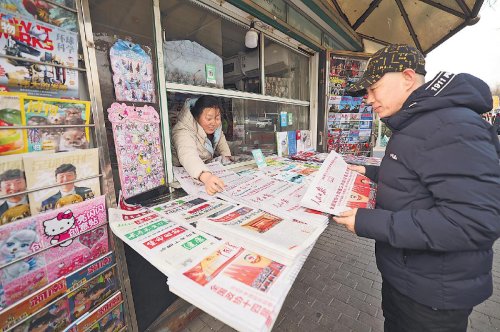 2025年全国两会召开以来,各地邮政全力以赴做好党报党刊投递工作,确保两会精神及时传递到基层。北京市邮政分公司精心组织,报刊发行局成立服务专班,设立分发专区,严控各环节时限;员工提前到岗,每日加密投递频次;开辟“专人专车、随到随送”绿色通道,实现重点区域报刊亭“当日见报率”达100%。图为北京西城区广安门外大街报刊亭“两会专架”前,市民一大早就来驻足翻阅、购买最新的刊载有两会报道的《人民日报》等报纸。