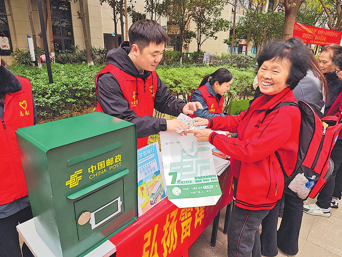 3月4日,广西壮族自治区柳州市邮政分公司参加了在长林社区冠亚尚成国际小区举行的学雷锋志愿服务活动。当天,柳州市分公司设立了专门的服务摊位,为附近的居民赠阅报刊和免费邮寄明信片,吸引了众多居民前往参与。□钟业荣 摄影报道