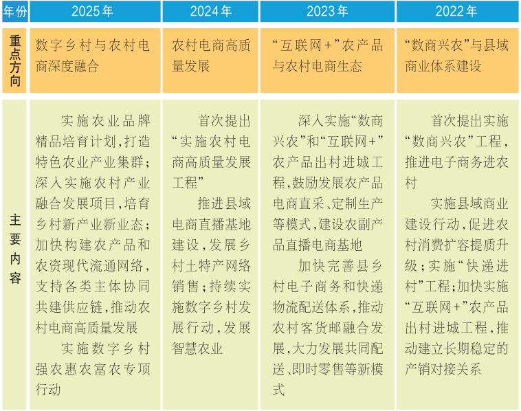 2月23日,2025年中央一号文件正式对外发布。这是党的十八大以来,中央连续发出的第13个指导“三农”工作的一号文件。近年中央一号文件及相关政策显示,农村电商已成为推动乡村振兴和实现农业现代化的重要抓手,政策导向逐步深化,覆盖基础设施建设、产业融合、数字化升级等多个维度,从销售到全产业链整合,从科技赋能到产业创新,从一二三产业融合到生态体系建设,持续为推进农业现代化和乡村全面振兴提供强大的活力与动力。