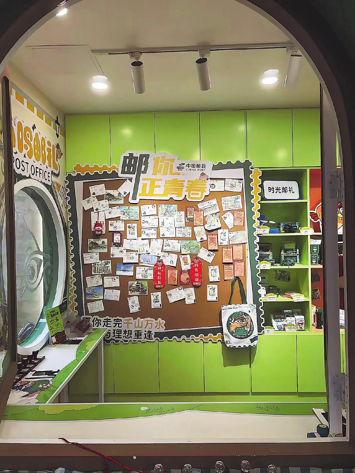 走进小鸣邮礼邮局,仿佛置身于一个充满童话色彩的世界。以广州市市鸟“画眉”为原型,融合广东传统戏剧粤剧元素打造的IP形象“小鸣”,或立于邮筒之上,或藏在明信片墙的缝隙间,仿佛在和游客捉迷藏。邮局的装修风格清新自然,以绿色为主色调,巧妙融入可爱的卡通元素,营造出温馨且充满活力的氛围。