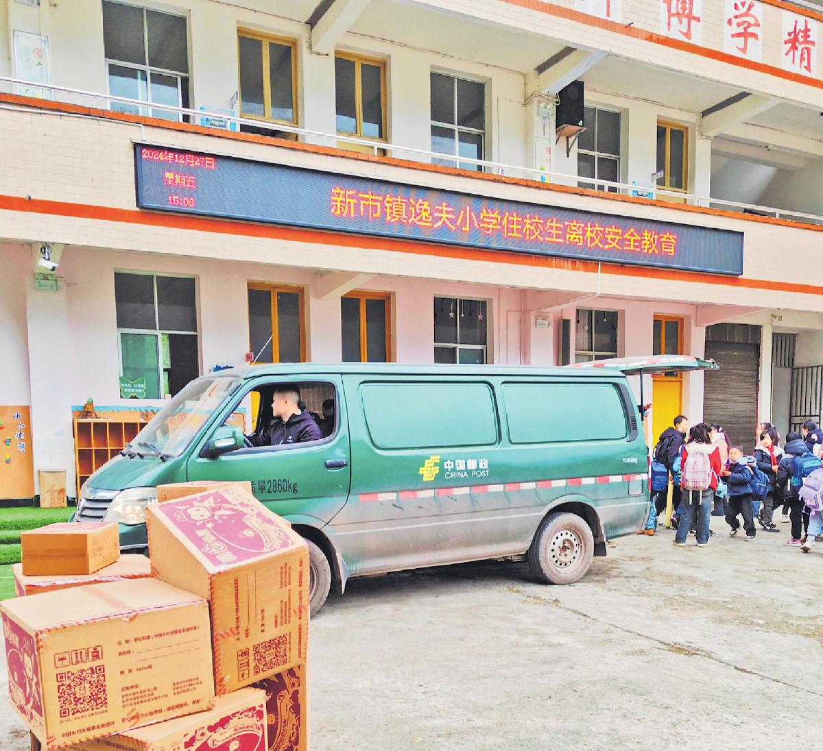 2024年末,邮车为宜宾市屏山县新市镇逸夫小学学生送去爱心包裹。