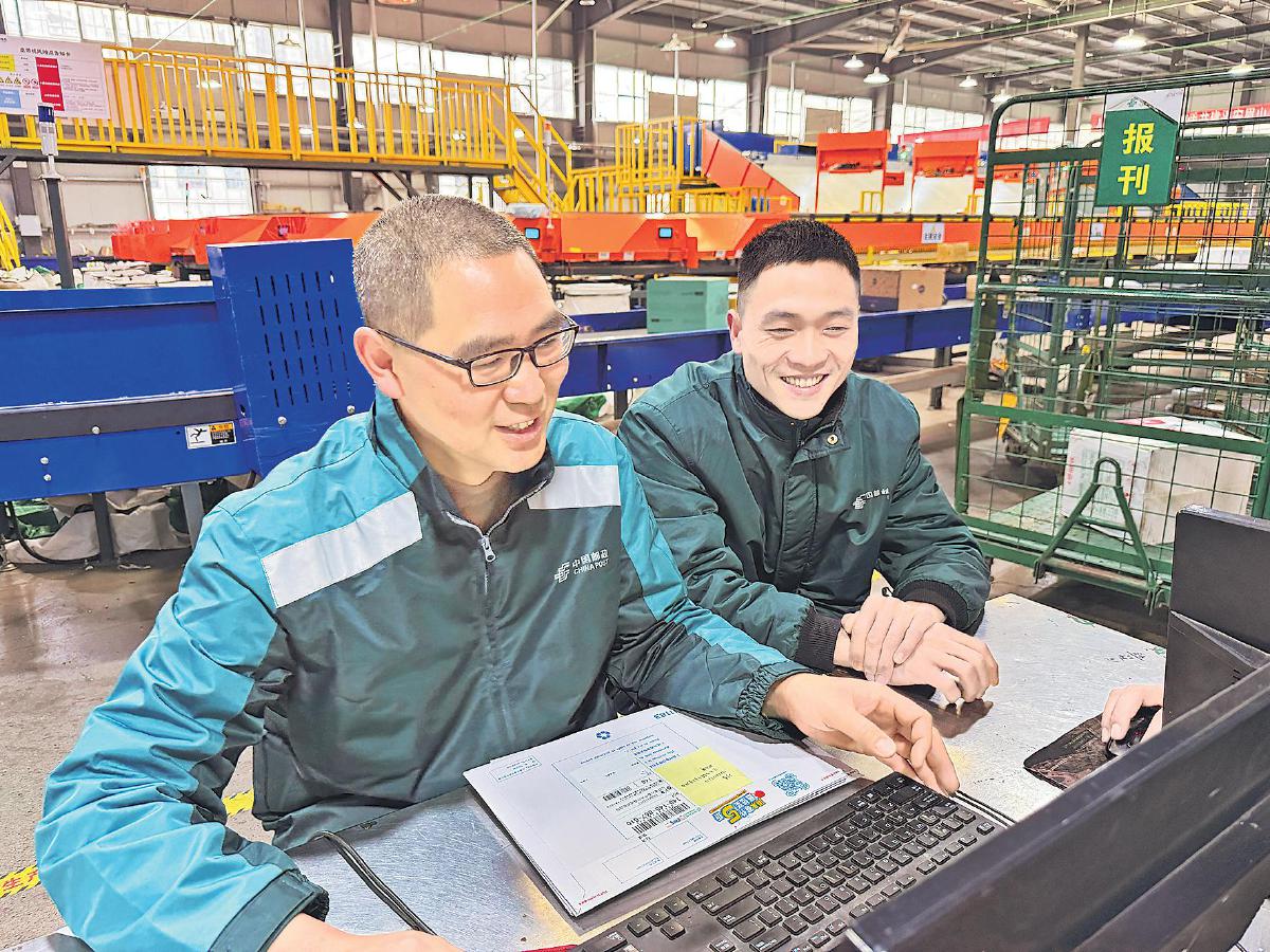 为验证想法的可行性,邱文波利用休息时间和同事一起调整传送带的分发程序设置,并在传送带两侧设置分拣区域,一边是城区邮件分拣区,另一边是乡镇邮件的暂存区。两周后,原本需要5名分拣员协作的工作,3人即可完成,效率提升近40%。“以前分拣城区、乡镇的包裹需要很长时间,现在重新调整了分拣流程,不仅分拣效率提高了,后续乡邮封发组的工作也轻松了。”负责封发的何静波感慨道。