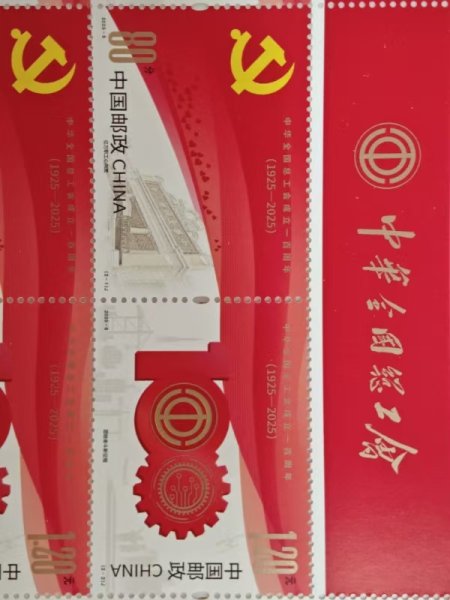 中国邮政定于2025年5月1日发行《中华全国总工会成立一百周年》纪念邮票1套2枚,邮票图案名称为:亿万职工心向党、团结奋斗新征程。由夏竞秋、于童设计,干止戈编辑。