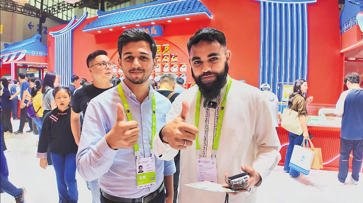 “消博邮局”推出的系列特色活动包括:邀请哪吒、敖丙等国漫IPcoser互动表演,海南漫画家唐杰提供Q版自画像定制服务,提供10款纪念戳供观众盖戳打卡,办理邮储银行信用卡赠露营车和“消博无忧寄”特惠券,满额赠“黄金银票”兑换礼品等,为参与者带来沉浸式的文化体验。图为来自巴基斯坦的两位观展商为盖戳打卡活动点赞。