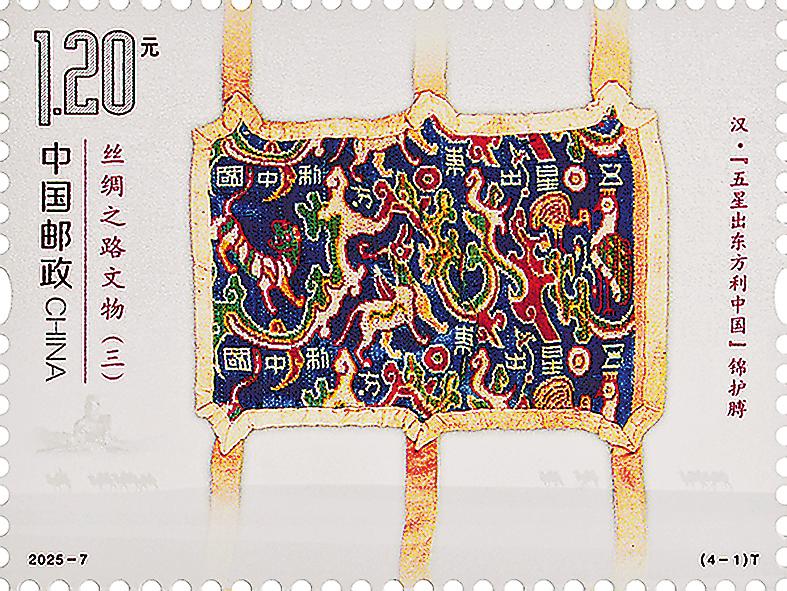 古丝绸之路绵亘万里,延续千年,积淀了以和平合作、开放包容、互学互鉴、互利共赢为核心的丝路精神,是人类文明的宝贵遗产。该套邮票展现了陆上丝绸之路由西到东沿线的4件珍贵的文物。其中,“五星出东方利中国”锦护膊出土于丝绸之路南道交通要冲的尼雅遗址,为汉代射箭时所用护臂(射褙);神人纹银盘出土于甘肃省靖远县北滩,是中国丝绸之路上发现的重要罗马文物;凸钉玻璃碗出土于宁夏固原市南郊的北周李贤夫妇合葬墓,该碗形制在萨珊时期的伊朗高原十分流行;胡人牵驼载丝壁画出土于河南省洛阳市安国相王孺人唐氏墓,生动再现了各国商人来到丝绸之路的东方起点之一洛阳,装载丝绸走上丝绸之路的场景。