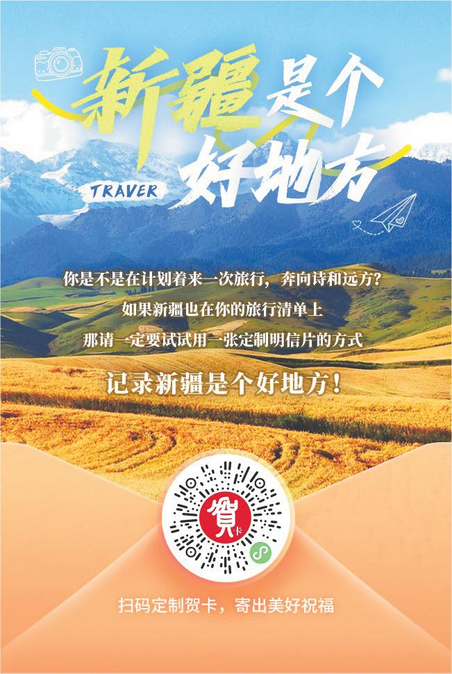 当指尖轻点,祝福带着天山的清风、大漠的辽阔、湖泊的清澈飞向远方时,一份对新疆的向往也随之悄然生根。这枚方寸之间的贺卡,承载着邮政服务民生的温度,更链接着新疆文旅产业无限可能的璀璨未来——每一次分享,都是新疆走向世界的脚步;每一次心动,都是文旅繁荣的崭新起点。