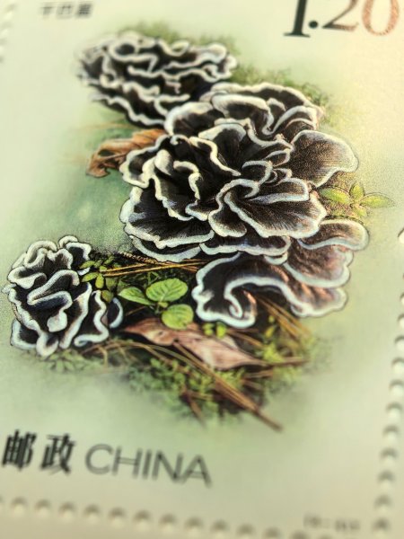 《食用菌(二)》邮票采用高精度胶版五色+香味墨+三维起凸多种工艺印制,使观赏者可通过视觉、触觉、嗅觉多维度层面欣赏邮票,营造沉浸式的感官联想,增强邮票的互动性和趣味性,实现工艺美学与互动趣味的有机融合。 该套邮票整体画面清晰,色彩清新淡雅,层次丰富,高精度五色胶印印制工艺使得邮票近乎完美的呈现出设计原稿的细腻柔美,其中蓝、专灰油墨在紫外灯下发绿色荧光,整体使用10μ调频局部调幅制版。黑、蓝、红、黄、专灰五种油墨的精准叠印,清晰捕捉到图稿特点,并精准还原图稿中各个蘑菇的每一处细节与色彩变化,还原了原稿的色彩表达和颜色层次,凸显出蘑菇的质感。从蘑菇伞帽表面的纹路、深浅不一的色泽过渡,到菌褶间微妙的光影变化,都清晰且细腻地复刻在邮票上。通过摩擦邮票画面激活松树味香味油墨,使邮票萦绕在森林草木的自然芬芳中,巧妙营造原生态氛围。同时,使用三维起凸工艺增强邮票的立体感,对蘑菇主体、伞帽、菌褶等不同部分进行不同的高度起凸,触觉差异还原了新鲜蘑菇的肌理。 在多种工艺的综合运用下,观赏者可通过视觉鉴赏、指尖触摸与嗅觉感知的多维度交互来欣赏邮票,触摸邮票时不仅能感受到立体的蘑菇手感,同时还激发香味油墨,从视觉、触觉、嗅觉多维度营造沉浸式的感官联想,增强邮票的互动性和趣味性,实现工艺美学与互动趣味的有机融合。
