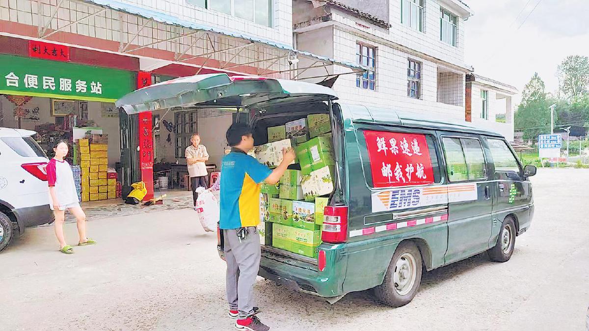 鲜桃装好箱后,由邮政揽投员装车运送至最近的收寄点。□许经纬 摄