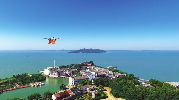 8月19日,在安徽省合肥市巢湖上空,无人机在配送快递包裹(无人机照片)。