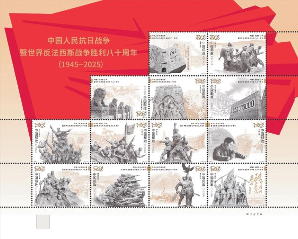 根据党中央有关中国人民抗日战争暨世界反法西斯战争胜利80周年纪念活动安排,中国邮政于9月3日发行《中国人民抗日战争暨世界反法西斯战争胜利八十周年》纪念邮票1套13枚、小型张1枚,全套面值为20.8元。
