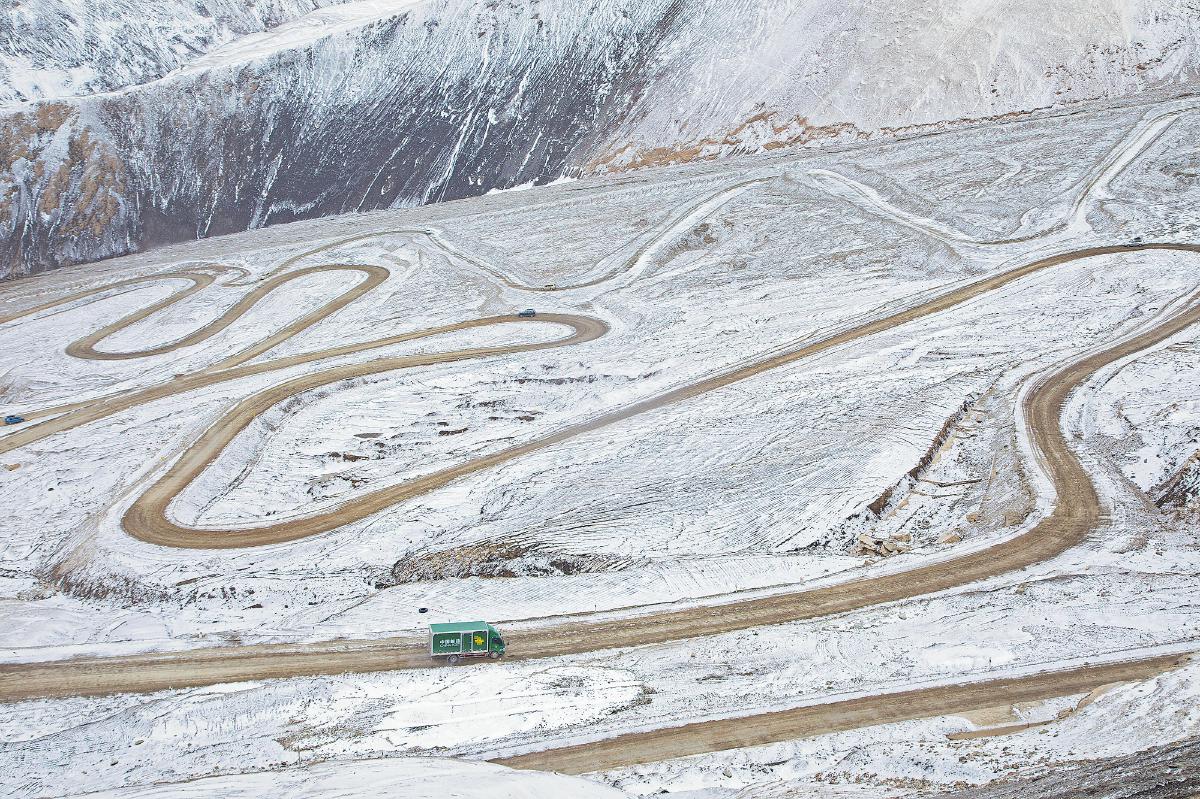 邮车行驶在蜿蜒的喀喇昆仑山路上。