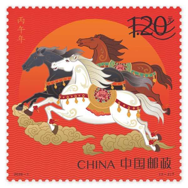 10月29日,中国邮政《丙午年》特种邮票图稿发布仪式在京举行。中国邮政集团有限公司党组书记、董事长刘爱力,党组副书记、总经理郑国雨,中国宋庆龄基金会党组书记、副主席沈蓓莉,中华全国集邮联合会会长戴应军,故宫博物院副院长王跃工,文化和旅游部、国家邮政局、中国国家博物馆、清华大学美术学院等单位嘉宾,以及本次生肖邮票图稿大众评审和专家评审代表出席活动。发布仪式上,公布了《丙午年》特种邮票图稿。 《丙午年》特种邮票由王红卫、赵恩重设计。邮票第一枚图名为“驰跃宏图”,以“腾跃新时代”为核心意象,展现了一匹红马奔驰于祥云之上,鬃毛如焰,四蹄生风。第二枚图名为“万骏臻福”,以“万马奔腾,驰骋千里”为核心意象,展现了三匹奔跑的骏马。三为众,寓意奔腾不息、共同奋进。图案背景及马身辅以祥云纹、火焰纹、缠枝纹等传统吉祥纹样,既隐喻福运连绵,亦强化东方美学底蕴。邮票中的骏马既展现出“一马当先”的开拓气概,也诠释了“万马奔腾”的团结力量,将马的形象与新时代中国人民奋发进取的精神风貌完美融合于方寸之间。 发布仪式上还公布了中国邮政贺年有奖明信片的图案,这些设计图稿均来自于《丙午年》特种邮票征集活动中。《丙午年》特种邮票图稿的创作及评审活动不仅是一次艺术创作竞赛,更成为了文化传承与创新的全民实践。