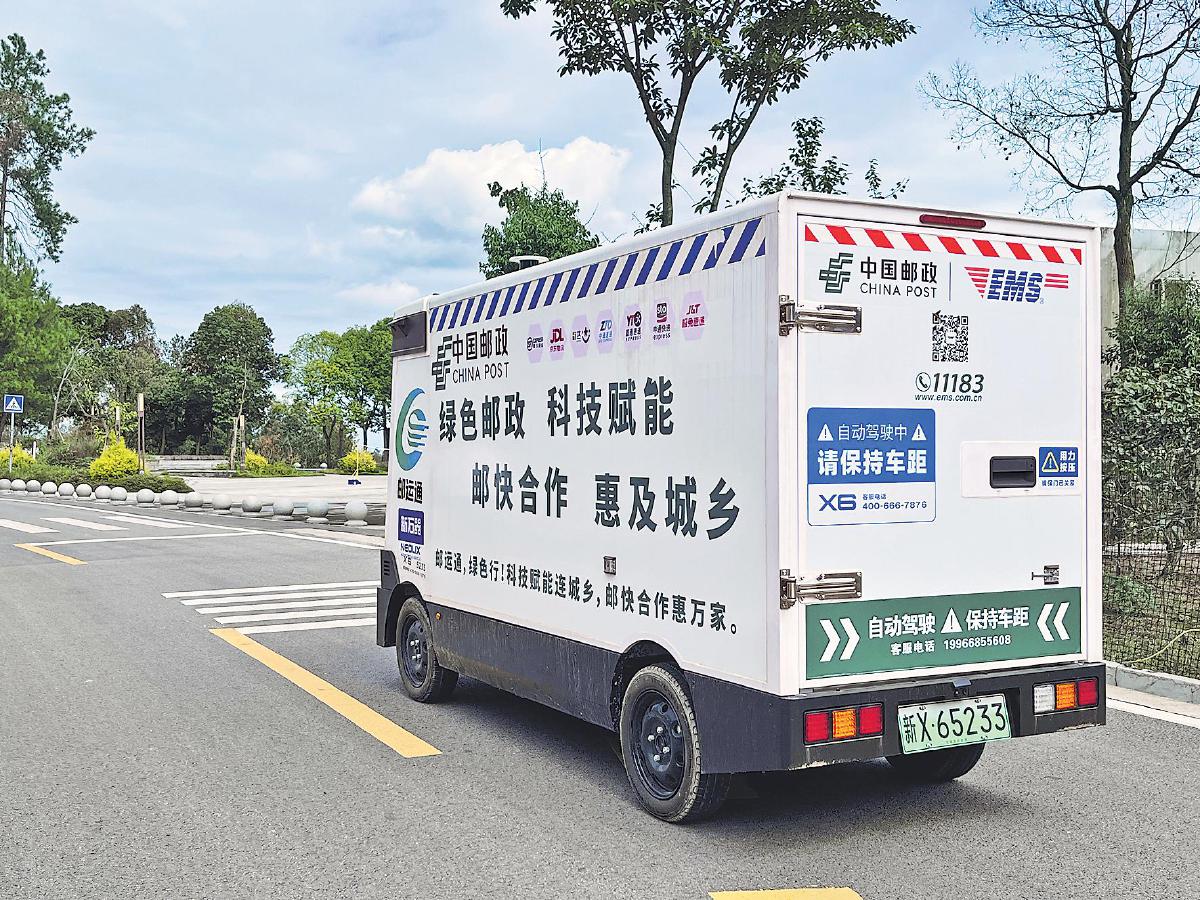 “邮运通”无人车行驶在街道上。