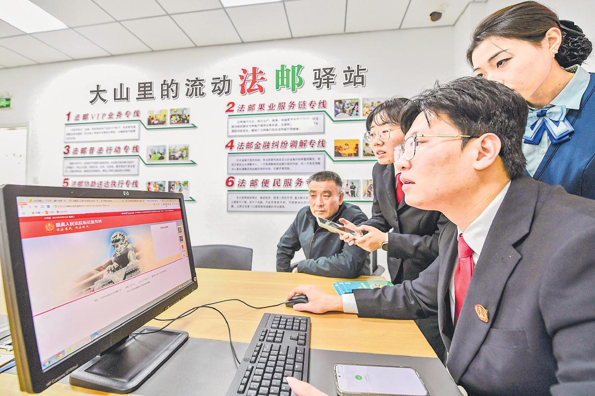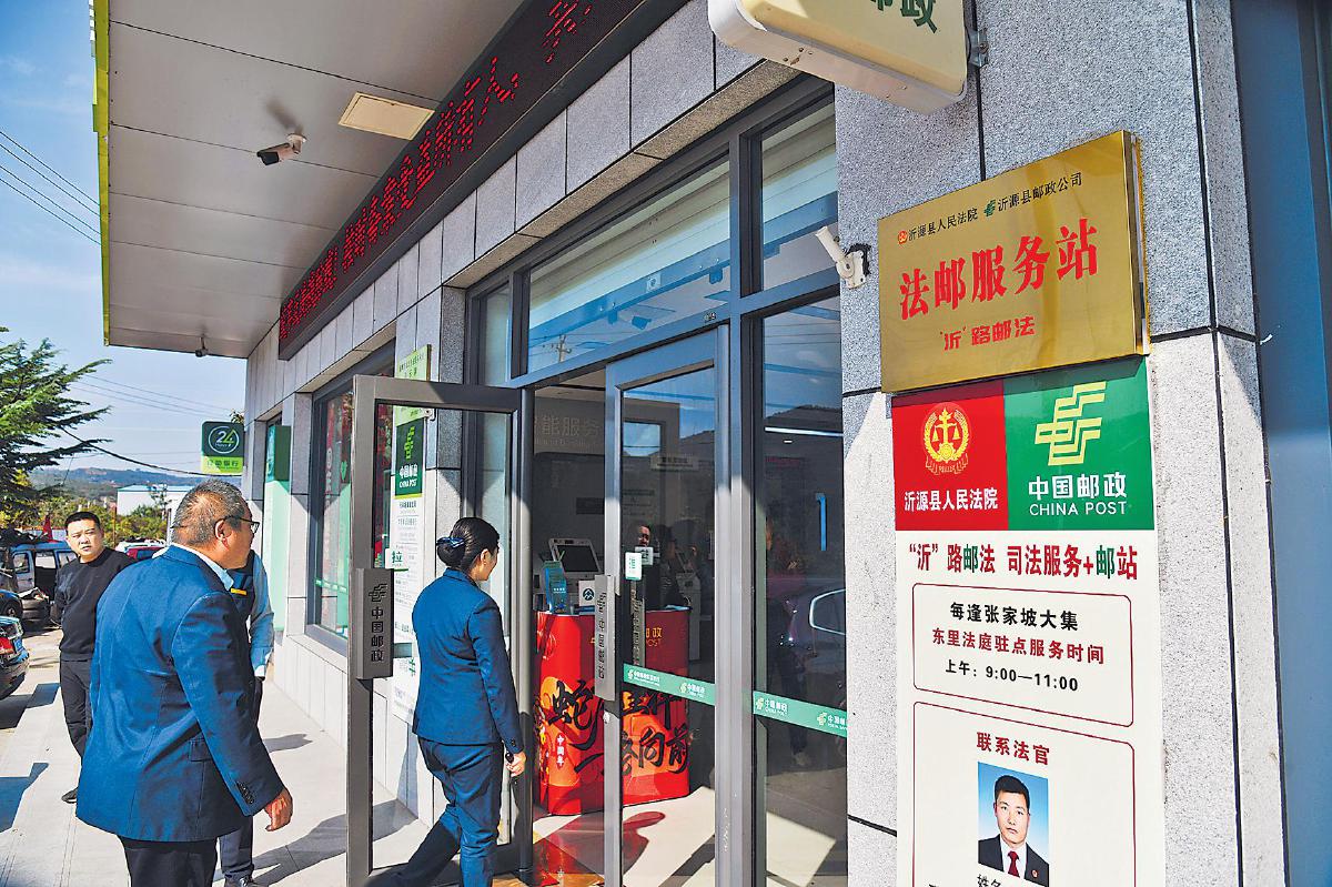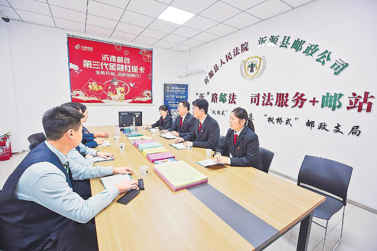 张家坡,山东省淄博市沂源县东南30公里处的小镇。镇上的张家坡邮政支局里,藏着一项不寻常的服务——法邮服务站的司法服务。这是山东省高级人民法院与山东省邮政分公司携手打造的“枫桥式”基层治理新样板,也是司法服务“贴地而行”的生动实践。群众在“家门口”的邮局就能进行立案、咨询、调解,甚至参与庭审;法律不再遥不可及,而是“一路有法、‘沂’路‘邮法’”。
