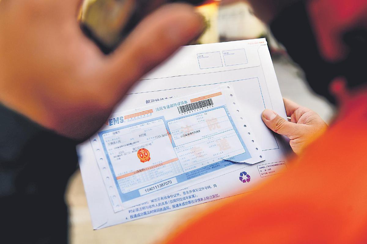 沂源县邮政分公司投递员在投递司法文书前联系收件人。
