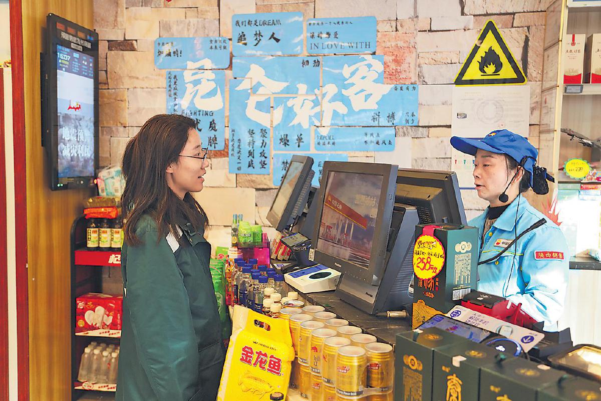 毛婉钰(左)与“昆仑好客”便利店客户交流。