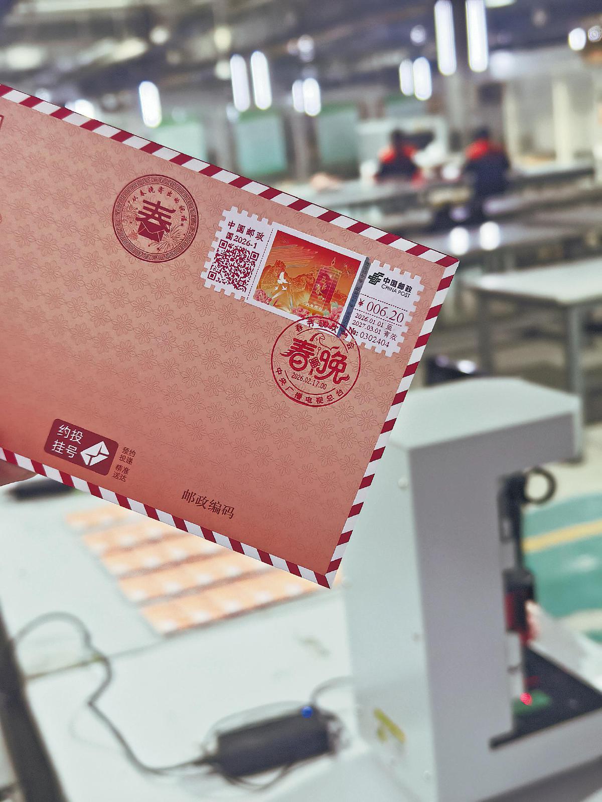 自1月初至除夕当天,所有通过线上下单的“2026年春晚寄福”纪念封套装,正陆续在这里完成打印、封装、盖戳和邮寄。