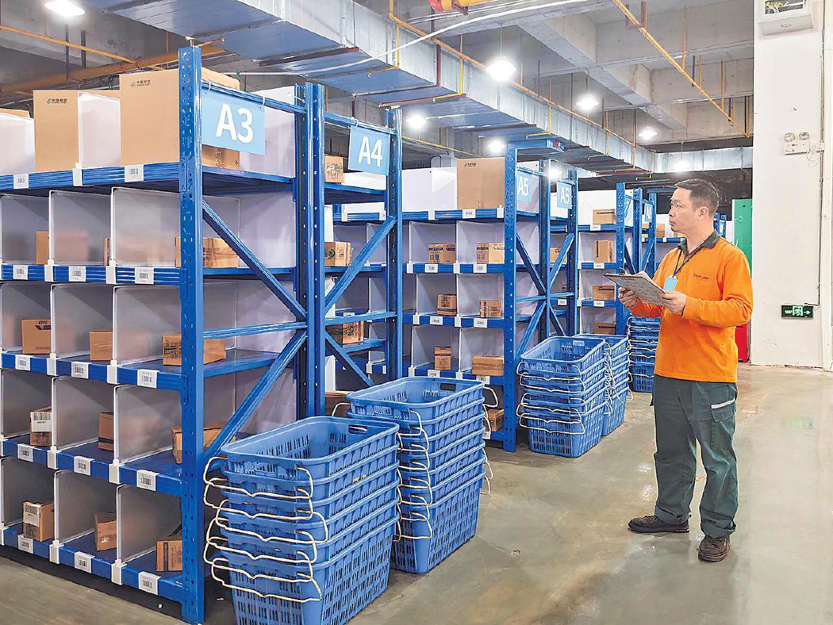 邮政工作人员查看集运仓库包裹情况。